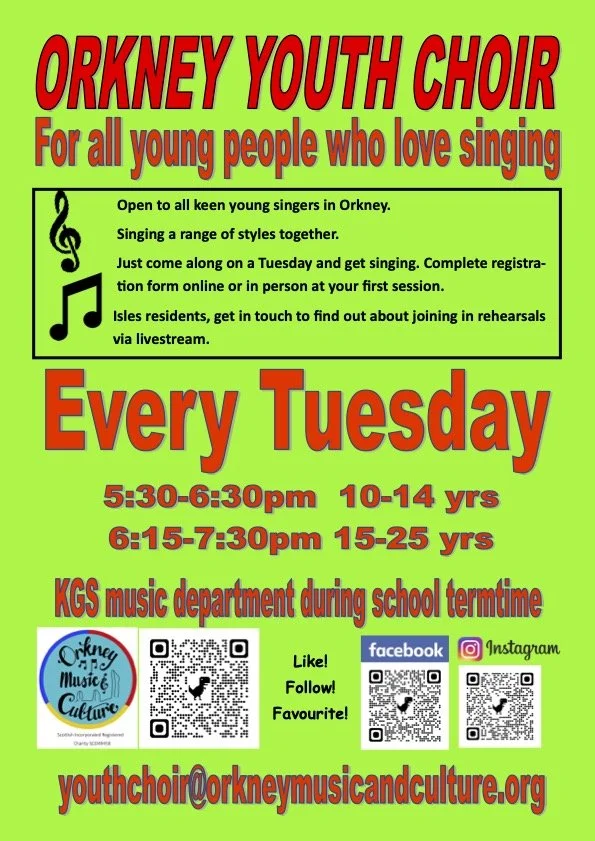 There is a new initiative from Orkney Music and Culture....an Orkney Community Youth Choir, This will run on a Tuesday early evening during the academic term time from 5.30pm until 6.30pm for 10 to 14 year olds and 6.30pm until 7.30pm for 15 to 25 year olds. Watch the video below for more information.